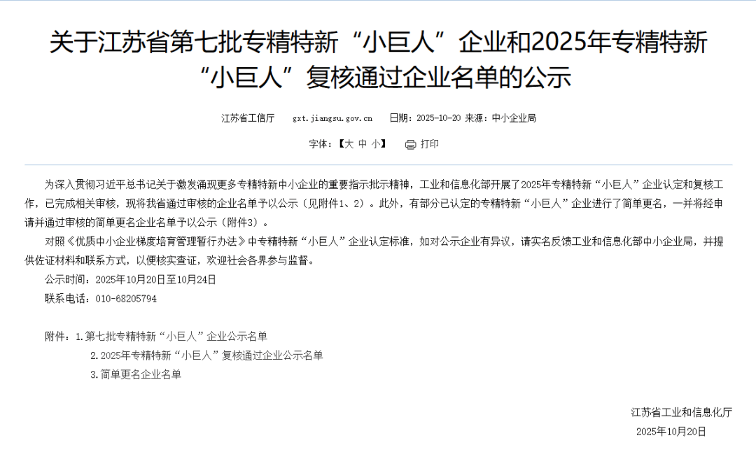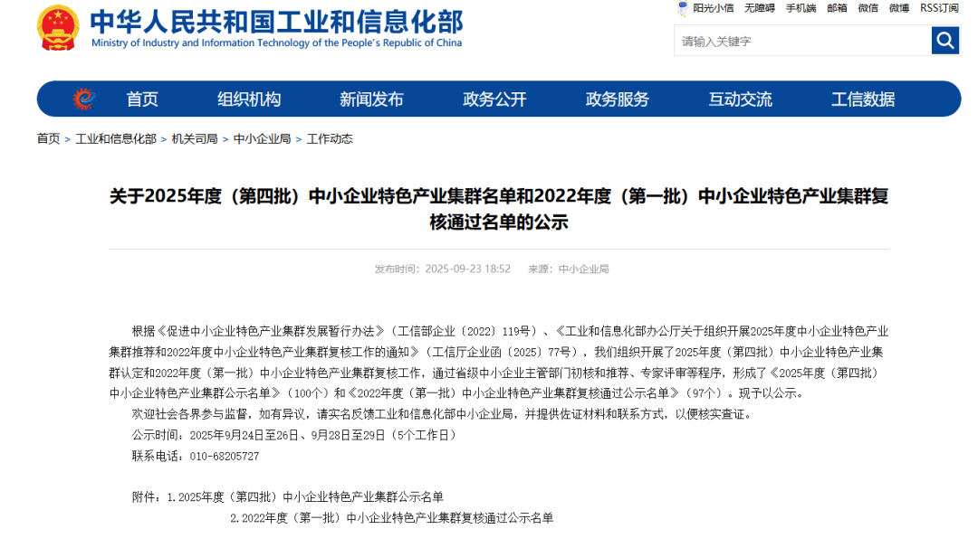 工信部公示的2025年度(第四批)中小企业特色财产集群名单,喜获国度级荣誉。